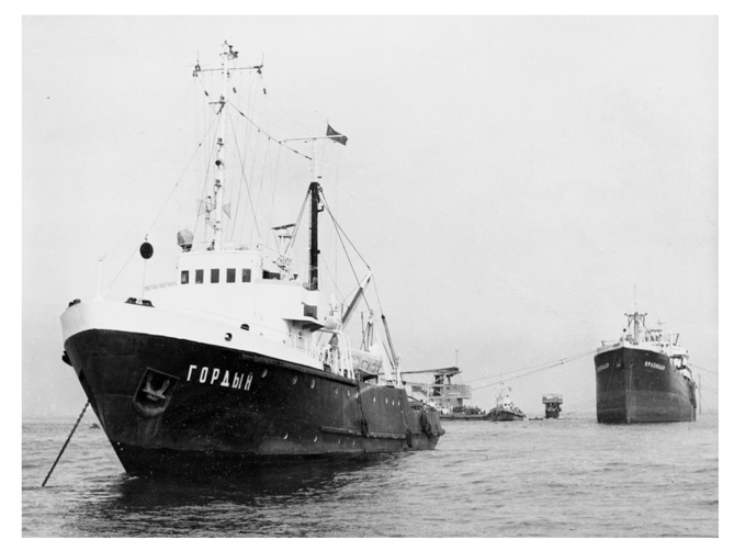 Затем подошли буксиры "Ударник", "Труд", "Рекорд", "Березань", катер "Бодрый", теплоходы "Зоринск", "Брацлав", ледокол "Сибиряков" и спасатель "Атлант".
