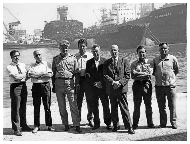 Руководители и участники подъема теплохода "Моздок". Слева направо - эксперт, главный водолазный специалист ВО "Совсудоподъем" Э.Л. Шлисс, главный инженер Отряда В.И. Спепкин, начальник Одесской группы ЭО АСПТР ЧМП Н.К. Чаплин, секреталь парткома В.П. Струнцов, начальник ВО АСПТР ЧМП Г.С. Леонтьев, зам. председателя ВО "Совсудоподъем" Н.П. Дгебуадзе, главный инженер ЭО АСПТР Каспара (Каспийское пароходство) В.Н. Карев, начальник техотдела В.К. Гвоздиков